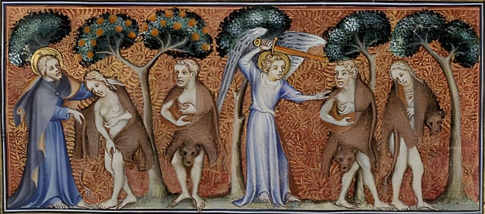 Enluminure d'une bible de 1372 : Adam et Ève chassés du Paradis